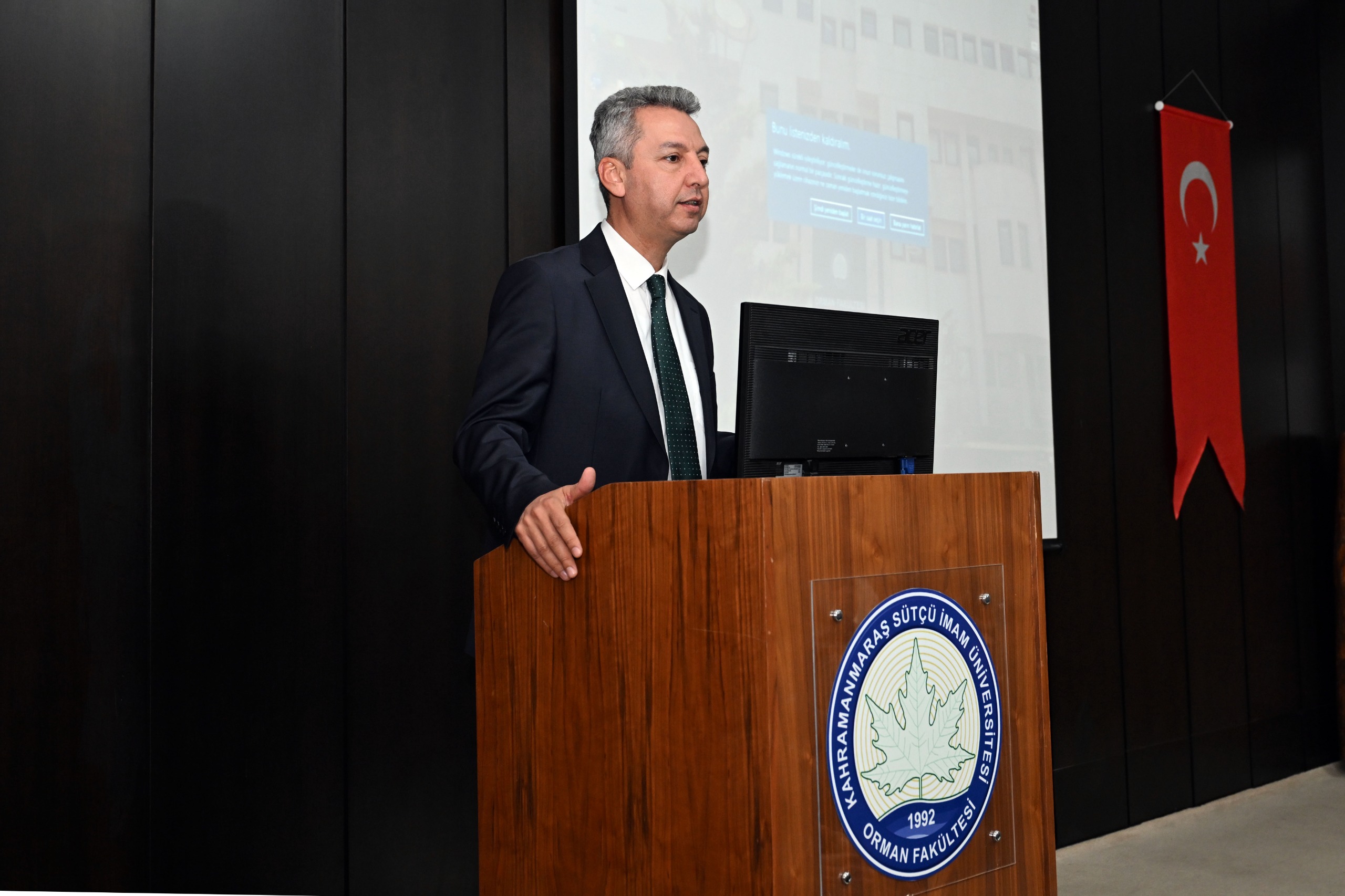 Ardından söz alan Rektörümüz Prof. Dr. İbrahim Taner Okumuş, üniversitenin stratejik hedefleri doğrultusunda fakültelerin rolüne dikkat çekerek, Orman Fakültesi’nin özellikle sürdürülebilir çevre yönetimi, doğal kaynakların korunması ve geliştirilmesi konularındaki önemine değindi. Akademik üretkenliğin artırılması, ulusal ve uluslararası projelerde daha etkin rol alınması gerektiğini ifade etti.