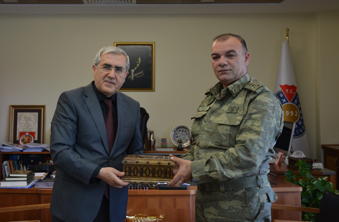 Nazik ziyaretleri için Garnizon Komutanı Albay Adnan Köşker’e teşekkürlerini ifade eden Rektör Can, ziyaretin anısına Köşker’e Kahramanmaraş el sanatlarının en güzel örneklerinden biri olan oyma ceviz sandık hediye etti.