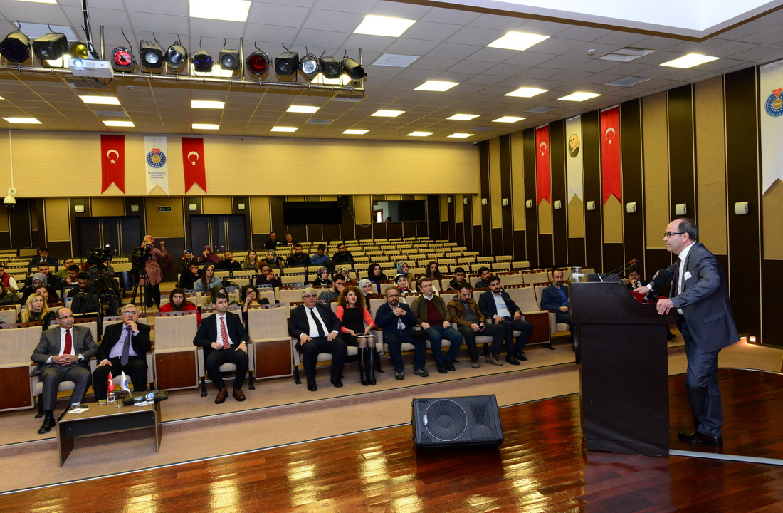Konferans sunumunun ardından Rektör Prof. Dr. Niyazi Can tarafından Doç. Dr. Ayhan Doğan’a günün anısına hediye takdimi gerçekleştirildi.