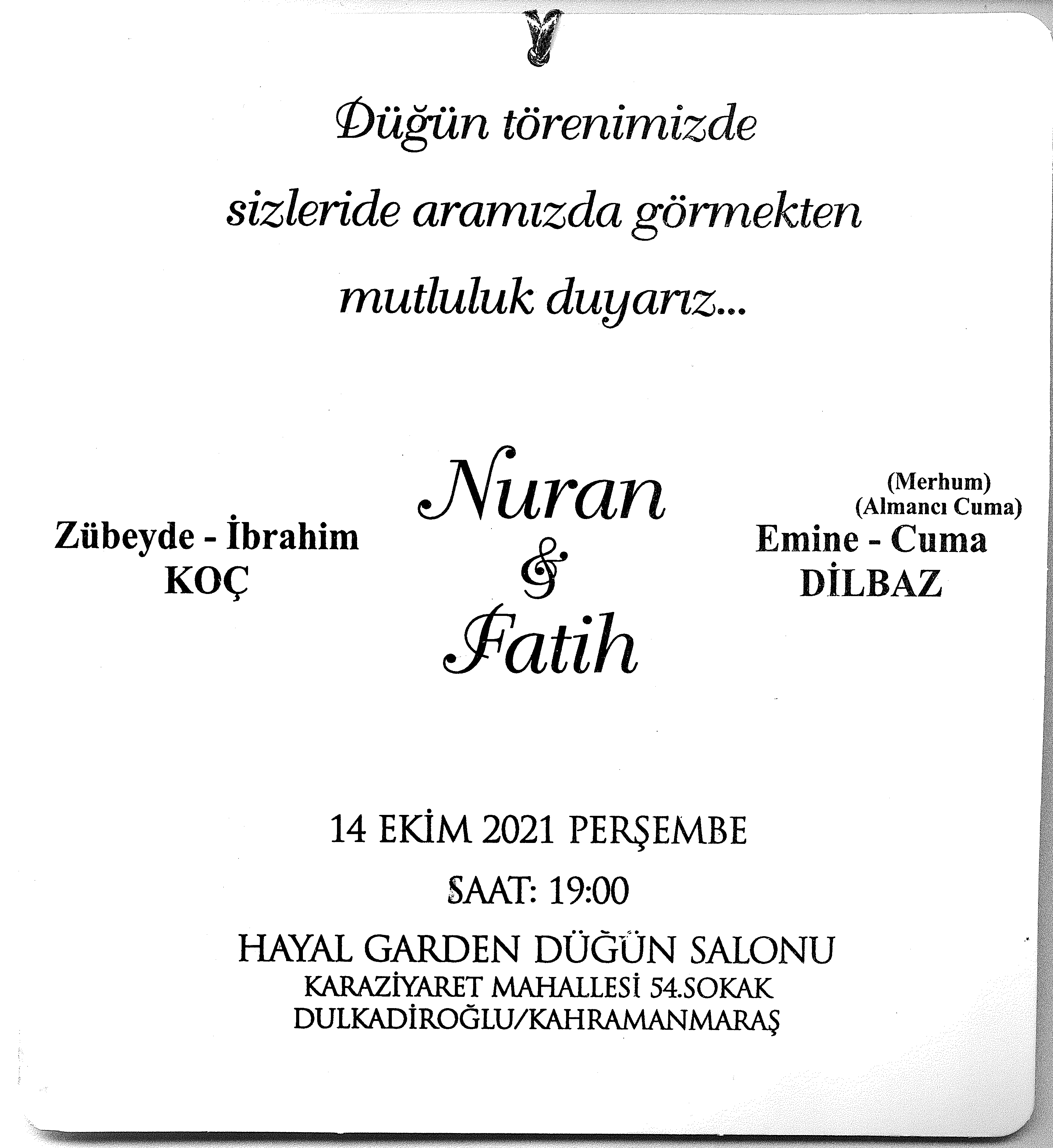 Teknik Bilimler Meslek Yüksekokulu personeli Fatih DİLBAZ, 14 Ekim 2021 Perşembe günü saat 19.00’da Hayal Garden Düğün Salonunda düzenlenecek törenle dünya evine girecektir. Genç çifti tebrik eder, mutluluklar dileriz.