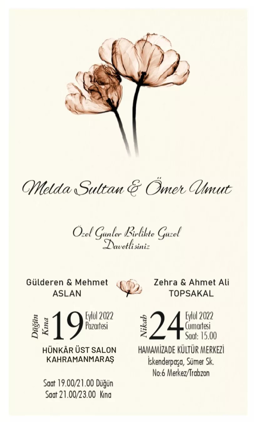 İdari ve Mali İşler Daire Başkanı Gülderen ASLAN'ın kızı Melda Sultan ASLAN'ın 19 Eylül 2022 Pazartesi günü saat 21.00-23.00 arası Hünkar Düğün Salonunda (Üst Salon) düğünü olacaktır. Aslan ailesini ve genç çifti tebrik eder, mutluluklar dileriz.