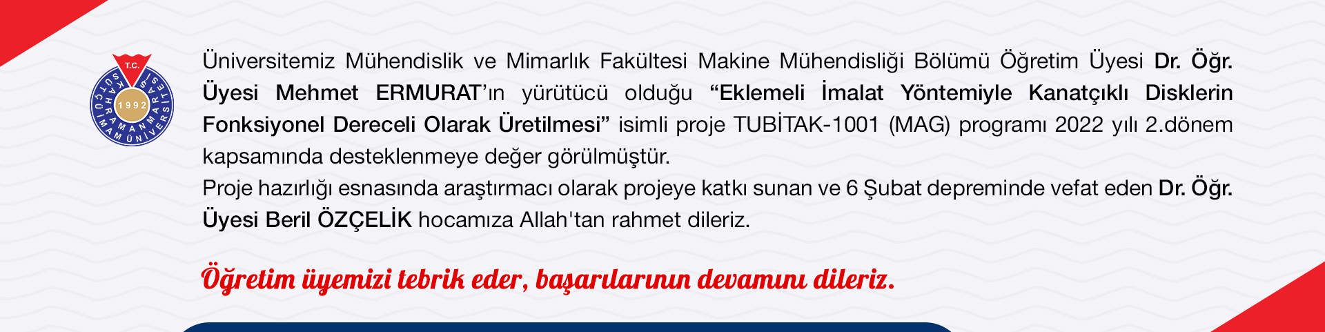 Eklemeli İmalat Yöntemiyle Kanatçıklı Disklerin Fonksiyonel Dereceli Olarak Üretilmesi projesine TÜBİTAK'tan destek
