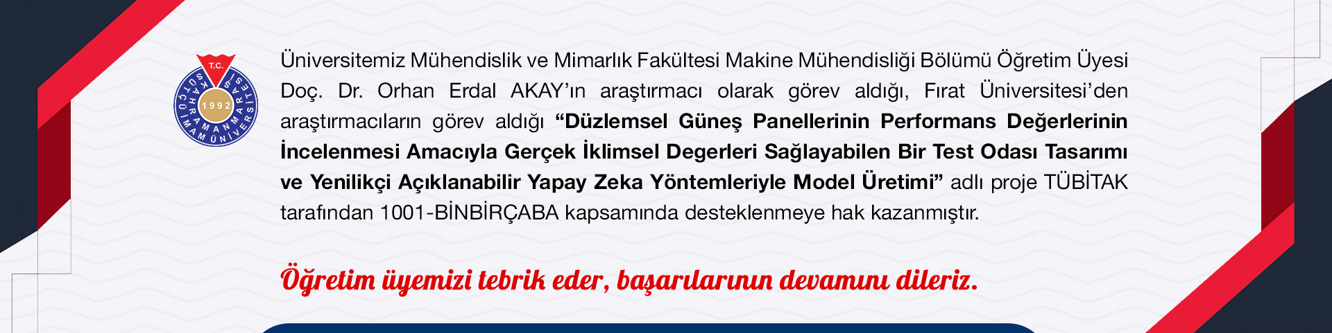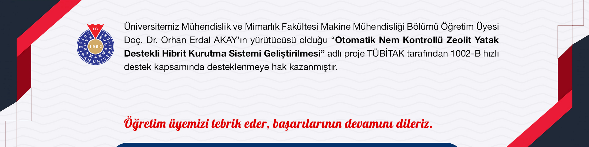 Otomatik Nem Kontrollü Zeolit Yatak Destekli Hibrit Kurutma Sistemi Geliştirilmesi projesi ve Düzlemsel Güneş Panellerinin Performans Değerlerinin İncelenmesi Amacıyla Gerçek İklimsel Degerleri Sağlayabilen Bir Test Odası Tasarımı ve Yenilikçi Açıklanabilir Yapay Zeka Yöntemleriyle Model Üretimi adlı proje TÜBİTAK tarafından desteklenmeye hak kazanmıştır
