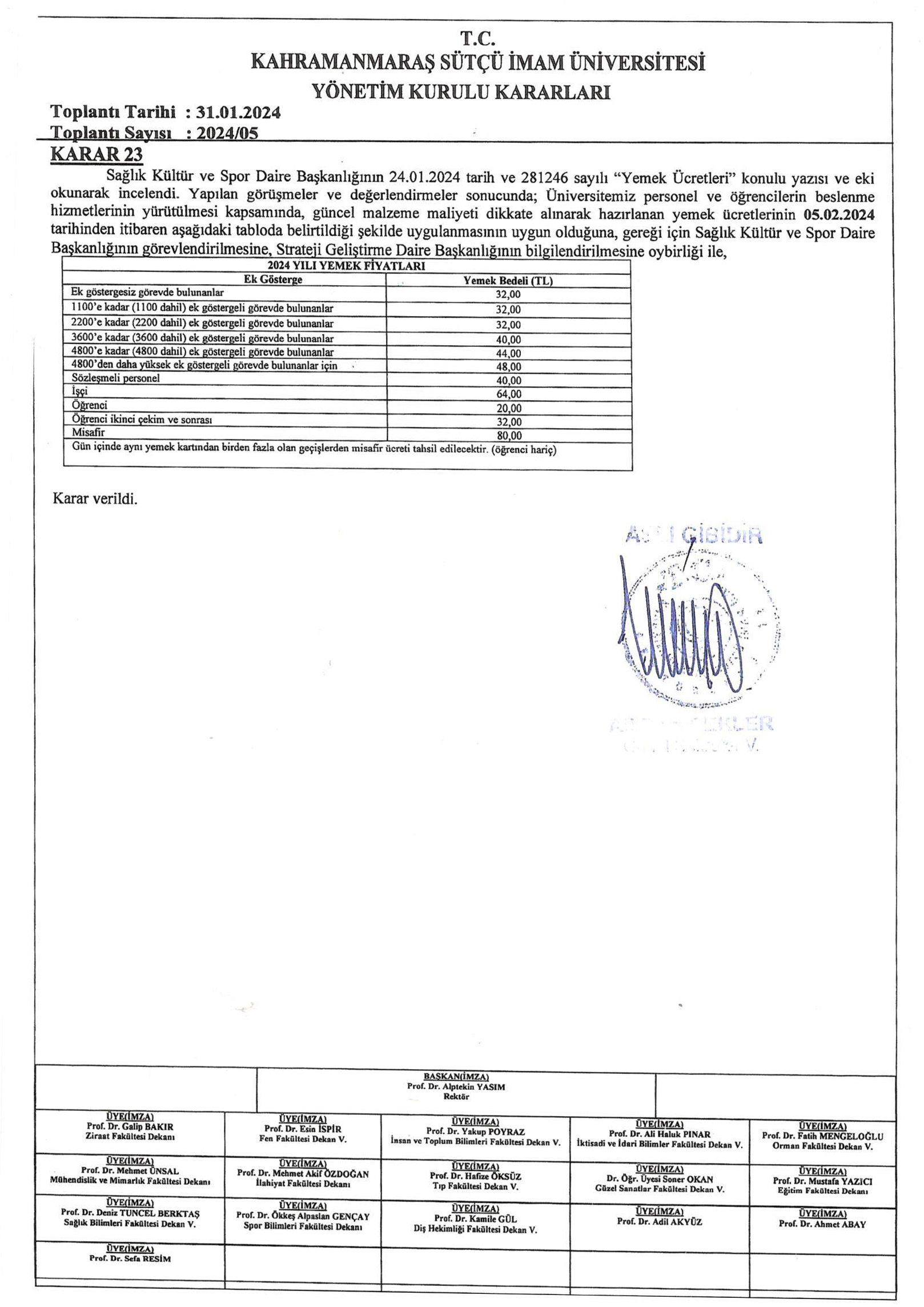 KSÜ Yönetim Kurulunun 31.01.2024 tarihinde almış olduğu 05.02.2024 tarihinden itibaren geçerli olan KSÜ yemek ücretleri aşağıdaki gibidir.