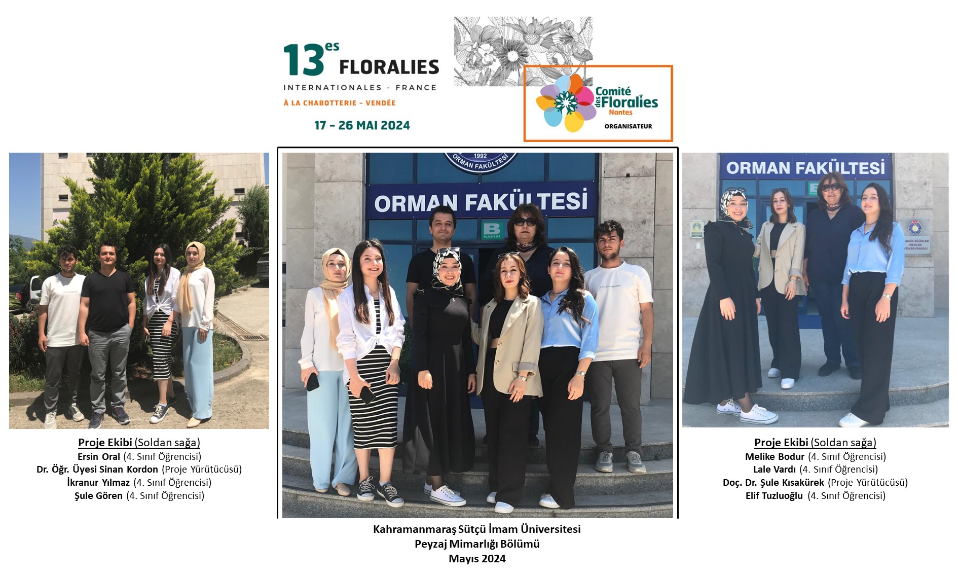 Floralies Internationales (Uluslararası Çiçekçiler Birliği) ve Comite Des Floralies/Nantes (Nantes Çiçek Komitesi) işbirliği ile Fransa’nın Montréverd şehrinde bu yıl 13.sü düzenlenen 2024 Bitki Fuarı Organizasyonu bünyesinde gerçekleştirilen ‘Geleneksel Çocuk Oyunları’ konseptli peyzaj tasarım yarışmasında Kahramanmaraş Sütçü İmam Üniversitesi (KSÜ) Peyzaj Mimarlığı Bölümü iki farklı proje ile Ülkemizi temsil eden tek katılımcı olmuştur.