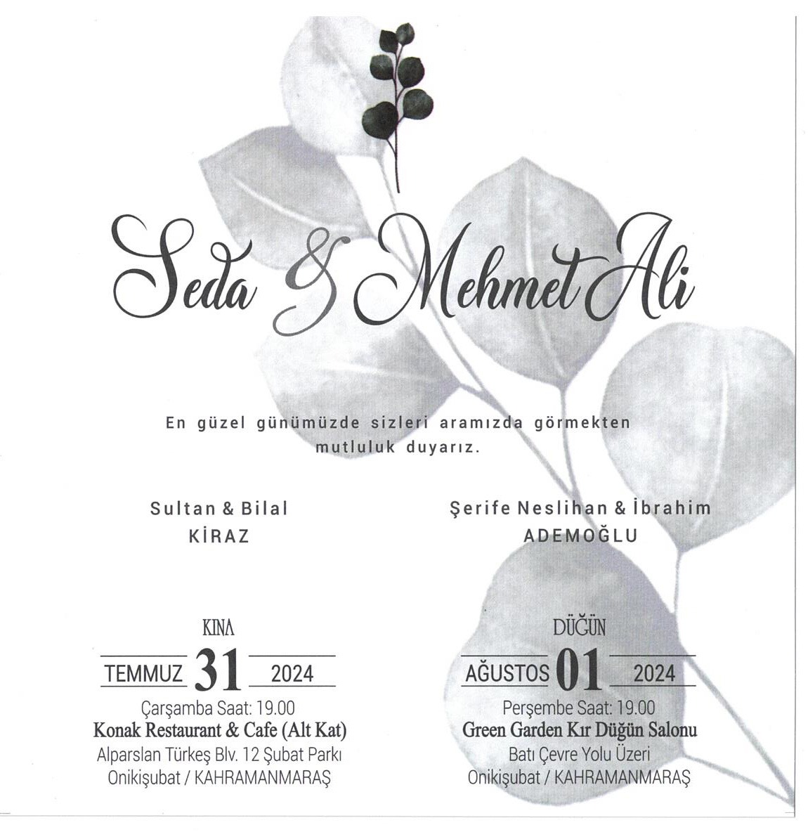 Üniversitemiz personeli İbrahim ADEMOĞLU'nun oğlu 01 Ağustos 2024 Perşembe günü Saat:19.00 'da Green Garden Kır Düğün Salonunda düzenlenecek düğün töreni ile dünya evine girecektir. Ademoğlu ailesini ve genç çifti tebrik eder, mutluluklar dileriz.