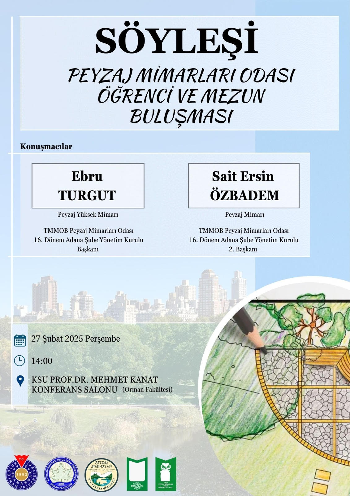 Kahramanmaraş Sütçü İmam Üniversitesi Orman Fakültesi ev sahipliğinde, TMMOB Peyzaj Mimarları Odası Adana Şubesi iş birliğiyle "Peyzaj Mimarları Odası Öğrenci ve Mezun Buluşması" başlıklı söyleşi düzenlenecektir.