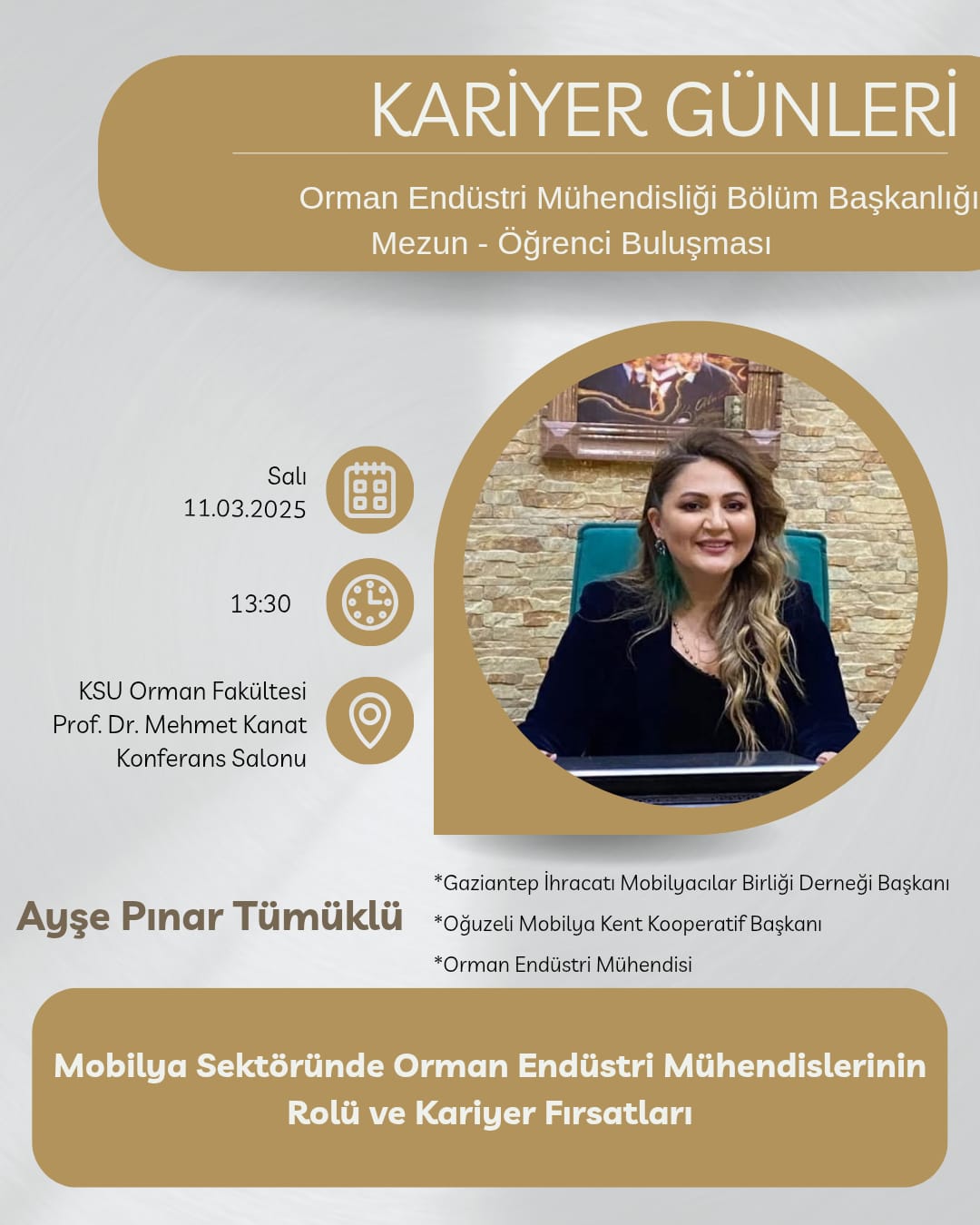 Kahramanmaraş Sütçü İmam Üniversitesi Orman Fakültesi Orman Endüstri Mühendisliği Bölüm Başkanlığı tarafından düzenlenen Kariyer Günleri etkinliği kapsamında, sektörün deneyimli isimlerinden Ayşe Pınar Tümüklü öğrencilerimizle bir araya gelecektir.