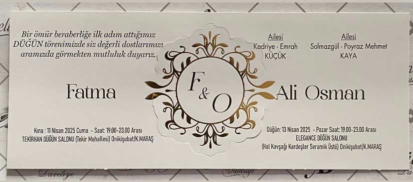 Teknik Bilimler Meslek Yüksekokulu Büro Personeli Ali Osman Kaya 13.04.2025 Pazar günü saat:19.30'da ELEGANCE Düğün Salonunda düzenlenecek düğün töreni ile dünya evine girecektir. KAYA Ailesini ve genç çifti tebrik eder, mutluluklar dileriz.