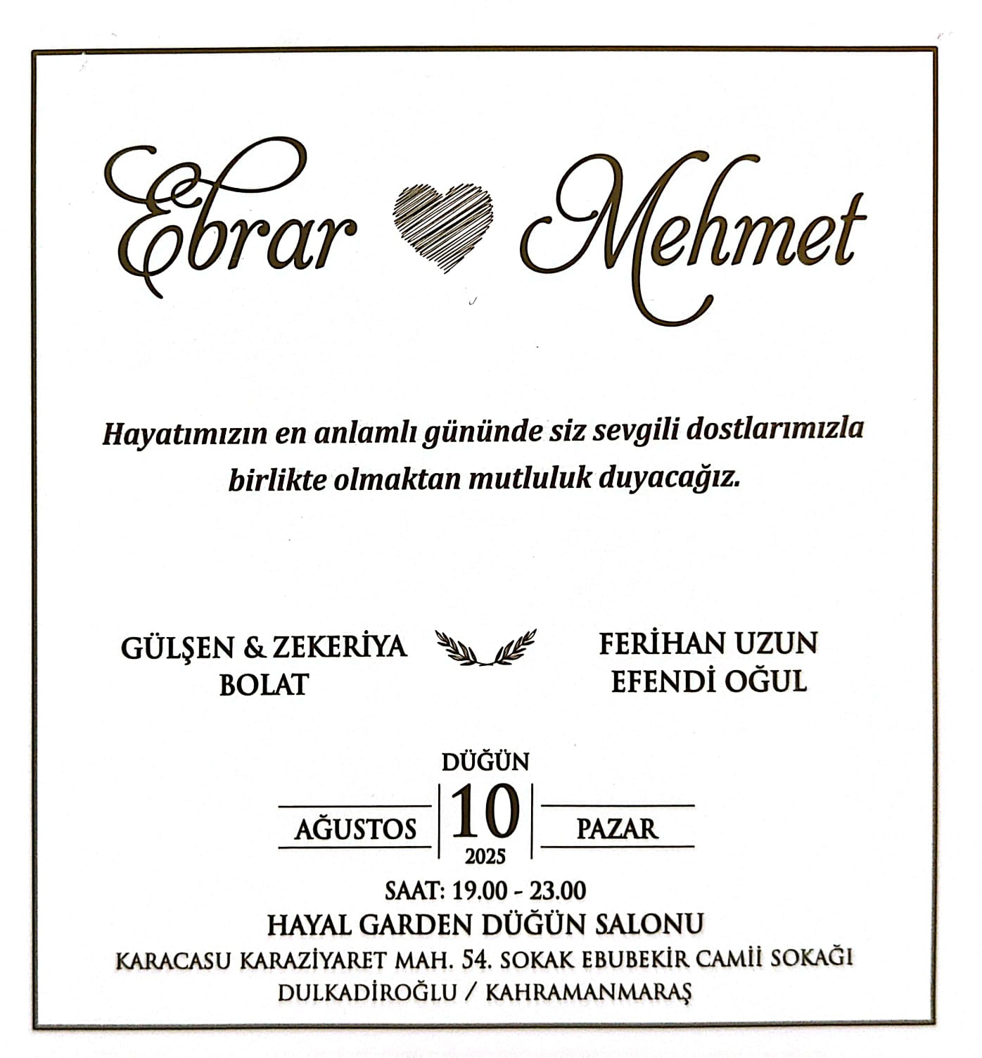 Üniversitemiz Teknik Bilimler Meslek Yüksekokulu personellerinden işçi Efendi OĞUL’un oğlu 10 Ağustos 2025 Pazar Günü Saat: 19.00-23.00 arası Hayal Garden Düğün Salonunda (Karacasu Kara Ziyaret Mah. 54.Sokak Ebubekir Camii Sokağı) düğünü olacaktır. OĞUL Ailesini ve genç çifti tebrik eder, mutluluklar dileriz.